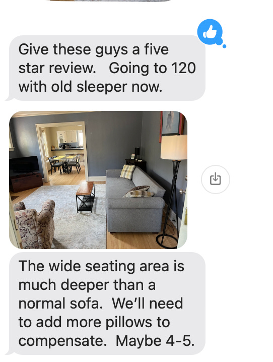 So the couch arrives. Andy’s ecstatic and calls me to tell me how wonderful the delivery service was and to give them the highest rating possible. He also gives them a fat tip. A bit later, he sends a picture of the couch and this text.